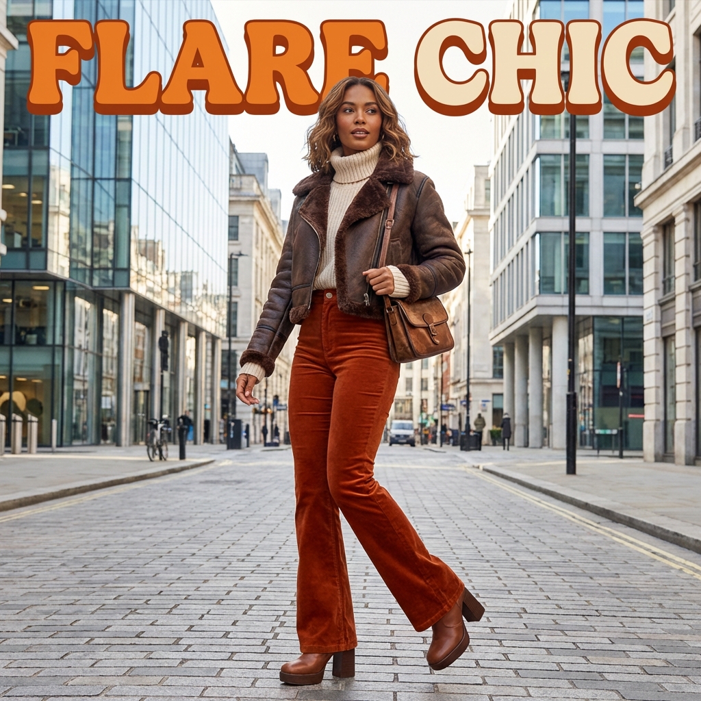 A trendy model with glowing skin and wavy medium-length hair wears high-rise flare pants.